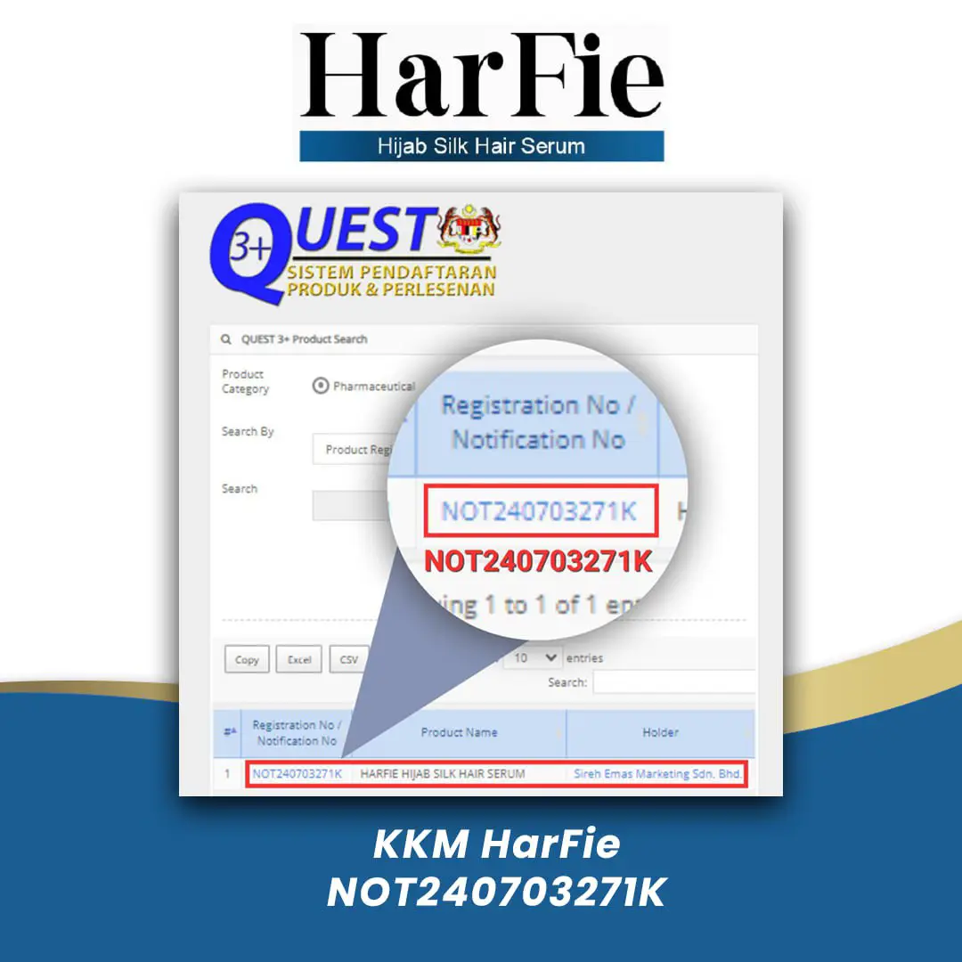 HarFie Serum 100% selamat dan diluluskan oleh Kementerian Kesihatan Malaysia (KKM) dengan nombor rujukan:(NOT240703271K)