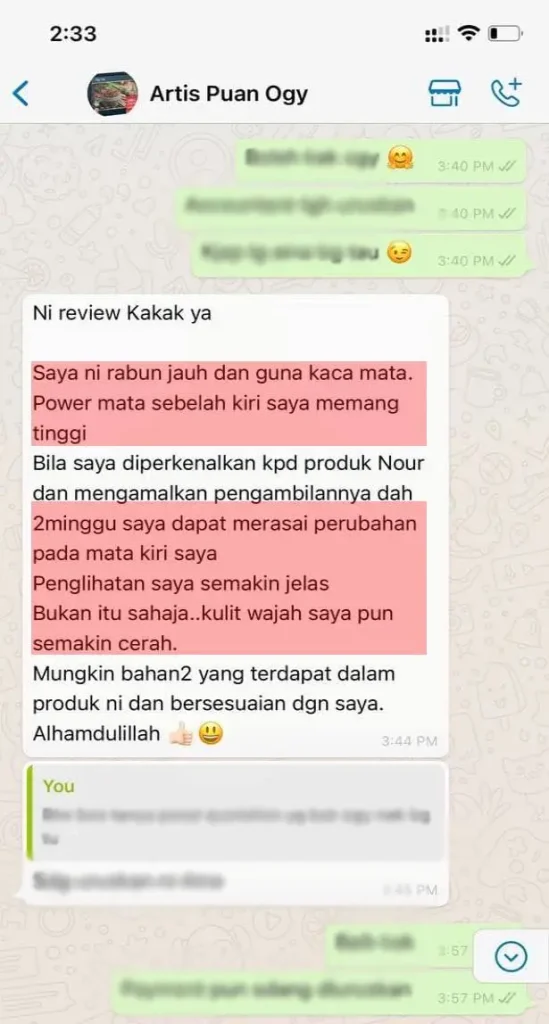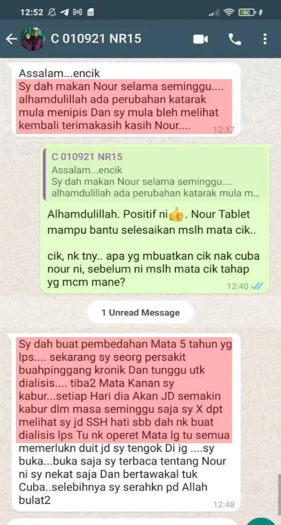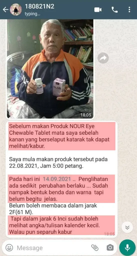 "Untuk anda yang mempunyai masalah mata, selaput dan katarak, selalu pandang gajet, takut memandu malam, mengaji Al-Quran tak dapat membaca dengan jelas.. Ini sangat bagus untuk anda."